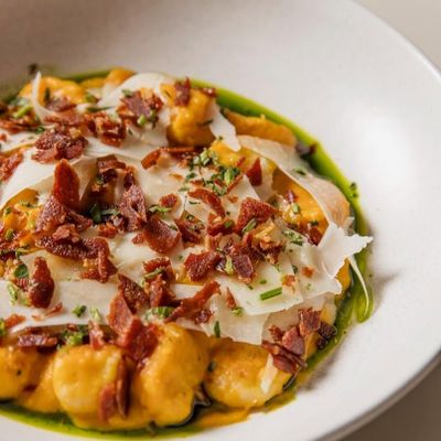 Potato Gnocchi, creamy pumpkin sauce, fresh corn, crispy prosciutto, pecorino, herb oil (VA)