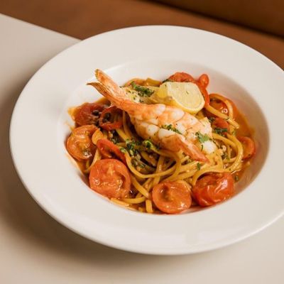 Mooloolaba Prawns, bisque, baby capers, cherry tomato, chilli, garlic, white wine, fresh herbs (GFO)
