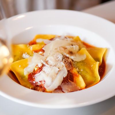 Spinach & ricotta filled ravioli with pomodoro sugo sauce, mixed fresh herbs, pecorino & parmesan cheese (V)