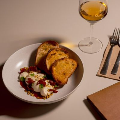 Creamy whipped ricotta with crispy prosciutto, balsamic, nduja honey, oregano, pistachio