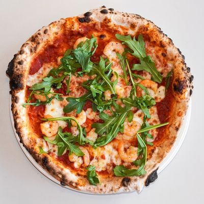 San Marzano tomato, Fior di latte mozzarella, prawns, garlic, fresh chilli, extra virgin olive oil, rocket