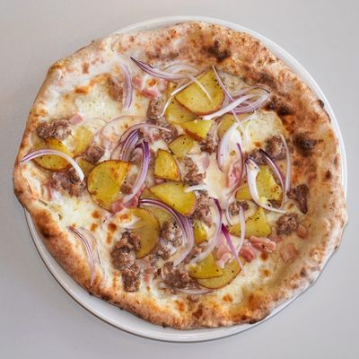 San Marzano Tomato, Fior di Latte Mozzarella, potato, italian sausage, bacon, red onion
